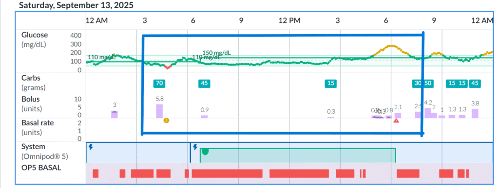 It always amazes me how little insulin I need for these events. I took only 8 units total for the day, compared to my usual 20–22 units. Keep in mind the day was 24 hours long, with 12 hours spent running — so most of those 8 units were simply my normal basal insulin for the other 12 hours when I wasn’t running.