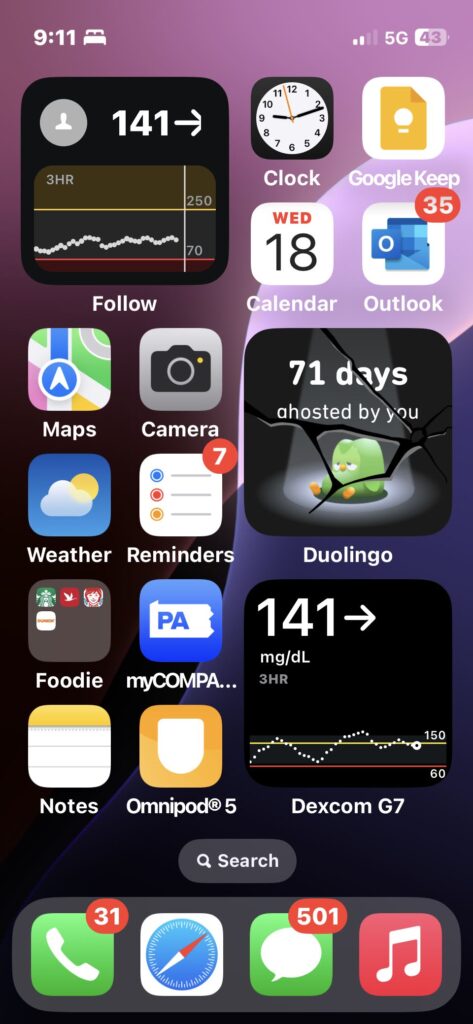 But take a look at this screenshot from my phone: Owen’s number is on top, mine’s on the bottom. Both of us holding steady and right where we want to be. And here’s the best part — a matching 141 mg/dl. What are the odds?!